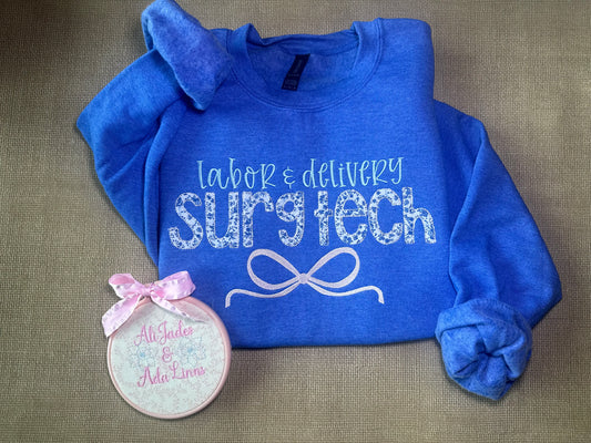 Floral appliqué Labor and Delivery, L&D surg tech embroidered bow tee or sweatshirt