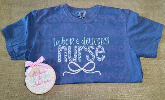 Floral appliqué Labor and Delivery, L&D Nurse embroidered bow tee or sweatshirt