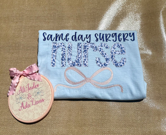 Floral appliqué same day surgery Nurse embroidered bow tee or sweatshirt